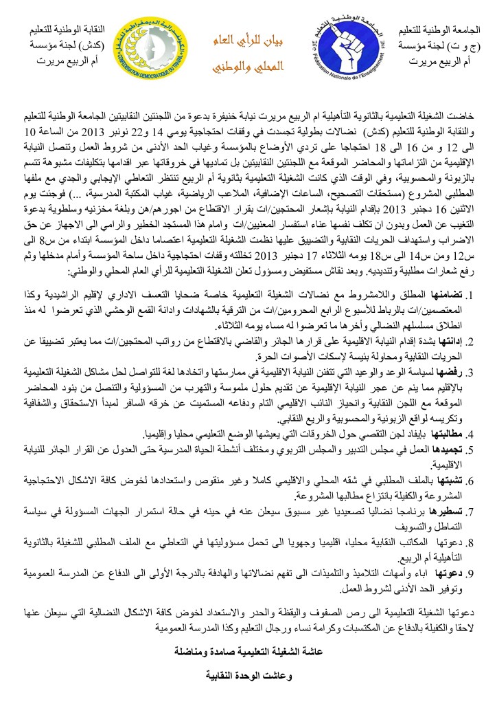 خاضت الشغيلة التعليمية بالثانوية التأهيلية ام الربيع مريرت نيابة خنيفرة بدعوة من اللجنتين النقابيتين الجامعة الوطنية للتعليم والنقابة الوطنية للتعليم (كدش) نضالات بطولية تجسدت في وقفات احتجاجية يومي 14 و22 نونبر 2013 من الساعة 10 الى 12 و من 16 الى 18 احتجاجا على تردي الأوضاع بالمؤسسة وغياب الحد الأدنى من شروط العمل وتنصل النيابة الإقليمية من التزاماتها والمحاضر الموقعة مع اللجنتين النقابيتين بل تماديها في خروقاتها عبر اقدامها بتكليفات مشبوهة تتسم بالزبونة والمحسوبية، وفي الوقت الذي كانت الشغيلة التعليمية بثانوية أم الربيع تنتظر التعاطي الإيجابي والجدي مع ملفها المطلبي المشروع (مستحقات التصحيح، الساعات الإضافية، الملاعب الرياضية، غياب المكتبة المدرسية، ...) فوجئت يوم الاثنين 16 دجنبر 2013 بإقدام النيابة بإشعار المحتجين/ات بقرار الاقتطاع من اجورهم/هن وبلغة مخزنيه وسلطوية بدعوة التغيب عن العمل وبدون ان تكلف نفسها عناء استفسار المعنيين/ات وامام هذا المستجد الخطير والرامي الى الاجهاز عن حق الاضراب واستهداف الحريات النقابية والتضييق عليهانظمت الشغيلة التعليمية اعتصاما داخل المؤسسة ابتداء من س8 الى س12 ومن س14 الى س18 يومه الثلاثاء 17 دجنبر 2013 تخللته وقفات احتجاجية داخل ساحة المؤسسة وأمام مدخلها وثم رفع شعارات مطلبية وتنديديه. وبعد نقاش مستفيض ومسؤول تعلن الشغيلة التعليمية للرأي العام المحلي والوطني: